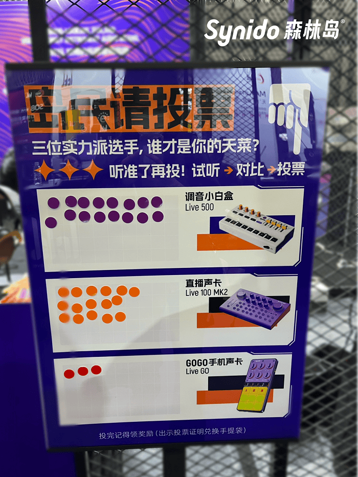 除了新品展示,森林岛别出心裁地策划了 “音乐巡回之旅” 主题打卡活动。展台内设置的数字乐器体验区通过1:1还原音乐人的真实创作桌搭,让观众得以零距离感受音乐工作流的魅力;而在金耳朵试炼区,调音小白盒声卡、Live 100MK2以及Gogo手机声卡同台竞技,由现场观众通过亲身试听进行投票,最终调音小白盒凭借其出色的性能与音质荣获最高人气。这一系列互动不仅提升了参与感,更让用户在体验中深化了对品牌产品实力的理解。